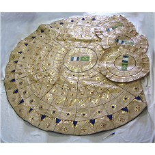 TAPETE (228X228 CM) NA COR BEGE, DE FORMATO CIRCULAR, CONFECCIONADO EM COURO. POSSUI DETALHES EM DOURADO, AZUL E VINHO, COM DESENHOS GEOMÉTRICOS LEMBRANDO NAIPES DE JOGO DE CARTAS. NO CENTRO, AS BANDEIRAS DO BRASIL E DA NIGÉRIA, CIRCUNDADAS PELA INSCRIÇÃO 'WITH COMPLIMENTS OF THE ALH-UMAR M. YAR'ADUA PRESIDENT OF THE FED. REP. OF NIG.C-IN-C OF THE ARMED FORCES / TO H.E. LUIZ INÁCIO LULA DA SILVA PRESIDENT OF THE FEDERATIVE REPUBLIC OF BRAZIL'. POSSUI FORRO ACOLCHOADO, EM TECIDO AZUL MARINHO. ACOMPANHA TRÊS CAPAS PARA ALMOFADA ( 69X69 CM) CONFECCIONADAS EM MESMO MATERIAL, COM FECHAMENTO EM ZÍPER. CADA UMA TEM, NO CENTRO, AS BANDEIRAS DO BRASIL E DA NIGÉRIA.