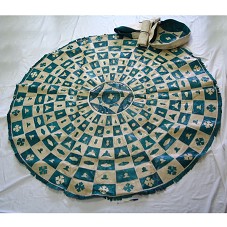 TAPETE (183X183CM) DE FORMATO CIRCULAR, CONFECCIONADO EM COURO NA CORES BEGE E VERDE, FORMANDO UM XADREZ. POSSUI DESENHOS GEOMÉTRICOS LEMBRANDO NAIPES DE JOGO DE CARTAS, E FRANJAS VERDES NA BORDA. NO CENTRO, A INSCRIÇÃO 'COMPLIMENTS OF THE FIRST LADY H.E. TURAI U. YAR'ADUA'. POSSUI FORRO ACOLCHOADO, EM CETIM VERDE. ACOMPANHA TRÊS CAPAS PARA ALMOFADA CONFECCIONADAS EM MESMO MATERIAL, COM FECHAMENTO EM ZÍPER E MESMO DESENHO DO CENTRO DO TAPETE.