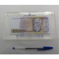 CINCO CÉDULAS NO VALOR DE MIL CRUZADOS, COM A FACE DE MACHADO DE ASSIS. CADA UMA POSSUI A INSCRIÇÃO 'REPRODUÇÃO' E ESTÁ ENTRE DUAS PLACAS DE ACRÍLICO (REDOMA). NA PLACA, A INSCRIÇÃO 'BANCO CENTRAL DO BRASIL / 2008 - ANO NACIONAL MACHADO DE ASSIS (1839-1908) / ...'.