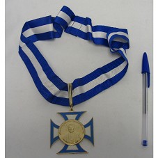 MEDALHA DE MÉRITO COMENDADOR SOARES. INSÍGNIA CONFECCIONADA EM METAL DOURADO, NO FORMATO DE UMA CRUZ GREGA (PATÉE) COM CENTRO ESTREITO E BRAÇOS CURVOS PARA FORA, NAS CORES AZUL E BRANCO. AO CENTRO, MOEDA COM EFÍGIE DO HOMENAGEADO, CIRCUNDADA COM A INSCRIÇÃO 'MEDALHA DE MÉRITO COMENDADOR SOARES'. NO REVERSO, 'CÂMARA MUNICIPAL DE NOVA IGUAÇU'. PRESA A FITA COM LISTRAS AZUIS E BRANCA.