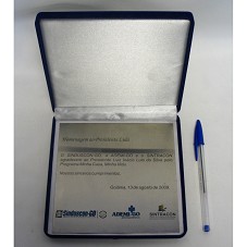 PLACA (14,5X15 CM) EM METAL PRATEADO, EM HOMENAGEM AO PRESIDENTE LULA. POSSUI A INSCRIÇÃO 'HOMENAGEM AO PRESIDENTE LULA / O SINDUSCON-GO, A ADEMI-GO E O SINTRACON AGRADECEM AO PRESIDENTE LUIZ INÁCIO LULA DA SILVA PELO PROGRAMA MINHA CASA, MINHA VIDA. NOSSOS SINCEROS CUMPRIMENTOS, GOIÂNIA, 13 DE AGOSTO DE 2009.'. POSSUI LOGOMARCAS DAS INSTITUIÇÕES ACIMA. FIXADA EM ESTOJO FORRADO DE VELUDO AZUL MARINHO.