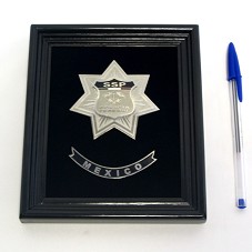 QUADRO (17X14,5 CM) COM MOLDURA EM MADEIRA PINTADA DE PRETO E FUNDO EM VELUDO AZUL MARINHO. POSSUI INSÍGNIA DA POLICIA FEDERAL DO MÉXICO FIXADA AO CENTRO SUPERIOR. NA PARTE INFERIOR, PLAQUETA COM A INSCRIÇÃO 'MEXICO'.