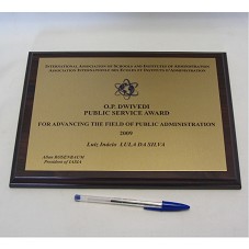 PREMIO 'O.P. DWIVEDI PUBLIC SERVICE AWARD', CRIADO PELA 'IASIA' PARA HOMENAGEAR PERSONALIDADES DE RENOME MUNDIAL QUE TENHAM CONTRIBUÍDO E CONTRIBUAM PARA O APRIMORAMENTO DA ADMINISTRAÇÃO PÚBLICA. PLACA (19X26,5 CM) EM METAL DOURADO FOSQUEADO, CONTENDO A GRAVAÇÃO 'INTERNATIONAL ASSOCIATION OF SCHOOLS AND INSTITUTES OF ADMINISTRATION / ... / O.P. DWIVEDI PUBLIC SERVICE AWARD / FOR ADVANCING THE FIELD OF PUBLIC ADMINISTRATION / 2009 / LUIZ INÁCIO LULA DA SILVA / ALLAN ROSENBAUM / PRESIDENT OF IASIA'. FIXADA EM BASE DE MADEIRA (23X30,5X1,5 CM).