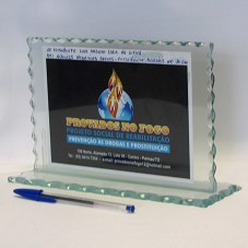 PLACA DE VIDRO (15X23 CM), EMOLDURANDO PAPEL DE FUNDO PRETO (13,5X18,5 CM) CONTENDO A INSCRIÇÃO 'PROVADOS NO FOGO / PROJETO SOCIAL DE REABILITAÇÃO / PREVENÇÃO ÀS DROGAS E PROSTITUIÇÃO / ... (ENDEREÇO)'. FIXADA EM BASE DE MESMO MATERIAL. NA PARTE SUPERIOR DO FOLHETO, DEDICATÓRIA 'DE ADONIAS NEGREIROS SOARES - PRESIDENTE DO PROVADOS NO FOGO / PARA O PRESIDENTE LUIZ INÁCIO LULA DA SILVA'.