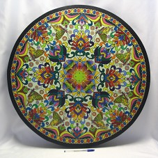 QUADRO (70X70 CM) DE FORMATO CIRCULAR. PINTURA SOBRE TELA, FIXADA EM CHASSIS DE MADEIRA, RETRATANDO UMA MANDALA. PINTURA MULTICOLORIDA, SOBRE FUNDO ESVERDEADO, COM BORDAS PRETAS. POSSUI ASSINATURA DO ARTISTA '2009 IVO MAIA'. NA PARTE POSTERIOR, INSCRIÇÃO NA MADEIRA 'TÍTULO: GRITO DA TERRA / UMA MANDALA SIMBOLOGIA - LIGAÇÃO DE DEUS A MENTE A MEMÓRIA HUMANA. / AUTOR - IVO MAIA / TENICA - ACRÍLICA SOBRE TELA / TAMANHO - 70X70 / NATAL RN BRASIL'.