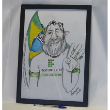 QUADRO (45X32,3 CM) COM MOLDURA PRETA E TAMPO DE VIDRO. EMOLDURA DESENHO, EM CARICATURA, DO PRESIDENTE LULA VESTINDO CAMISA DO 'INSTITUTO FEDERAL DE EDUCAÇÃO, CIÊNCIA E TECNOLOGIA IPANGUAÇU-RN', MOSTRANDO O NÚMERO '3' COM OS DEDOS DA MÃO. AO FUNDO, BANDEIRA DO BRASIL. NO CANTO INFERIOR DIREITO, ASSINATURA DO ARTISTA 'GEILSON SILVA'.