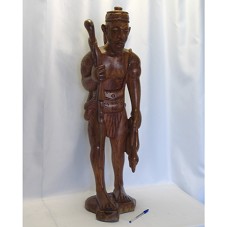 ESCULTURA (81 CM) ENTALHADA EM PEÇA ÚNICA DE MADEIRA. FIGURA DE UM HOMEM, COM TRAJES TÍPICOS, SEGURANDO EM UMA DAS MÃOS, UMA LANÇA; NA OUTRA, UM ANIMAL MORTO.