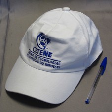 BONÉ EM TECIDO BRANCO. NA FRENTE, BORDADO EM AZUL, A INSCRIÇÃO 'CETENE / CENTRO DE TECNOLOGIAS ESTRATÉGICAS DO NORDESTE' E LOGOMARCA.