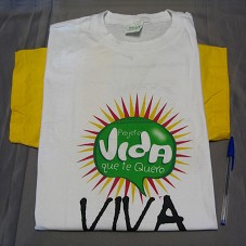 CAMISETA (TAM G) EM MALHA BRANCA, DE MANGA CURTA E AMARELA. NA FRENTE, ESTAMPA EM VERDE COM RAIOS AMARELO E VINHO, CONTENDO A INSCRIÇÃO 'PROJETO VIDA QUE TE QUERO / VIVA'. ATRÁS NOMES E LOGOMARCAS DAS INSTITUIÇÕES 'VOTORANTIM / PREFEITURA MUNICIPAL DE SOBRAL / CONSELHO MUNICIPAL DOS DIREITOS DA CRIANÇA E DO ADOLESCENTE DE SOBRAL / FUNDAÇÃO DE AÇÃO SOCIAL DO MUNICÍPIO DE SOBRAL'.