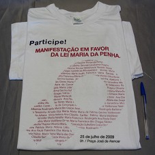 QUATRO CAMISETAS IGUAIS (TAM G), EM MALHA BRANCA, DE MANGA CURTA. NA FRENTE, A INSCRIÇÃO 'PARTICIPE / MANIFESTAÇÃO EM FAVOR DA LEI MARIA DA PENHA / 25 DE JULHO DE 2009 / 9H PRAÇA JOSÉ DE ALENCAR', E SÍMBOLO FEMININO DESENHADO COM NOMES DE MULHERES. ATRÁS, LOGOMARCAS DAS INSTITUIÇÕES DE APOIO E REALIZAÇÃO.