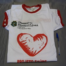CAMISETA (TAM G) EM MALHA BRANCA, DE MANGA CURTA, COM DETALHES EM VERMELHO. NA FRENTE, ESTAMPA DE UM CORAÇÃO VERMELHO EM CHAMAS E A INSCRIÇÃO 'PROJETO SAÚDE BOMBEIROS E SOCIEDADE'. ACIMA, 'GOVERNO DOESTADO DO CEARÁ / SECRETARIA DE SEGURANÇA PÚBLICA E DEFESA SOCIAL / CORPO DE BOMBEIROS MILITAR'. ATRÁS, 'CORPO DE BOMBEIROS'.