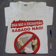 CAMISETA (TAM G) EM MALHA BRANCA, DE MANGA CURTA. NA FRENTE, A INSCRIÇÃO 'DIGA NÃO À ESCRAVIDÃO / SÁBADO NÃO / VAMOS CUMPRIRA LEI DO PISO, JORNADA É DE 40 HORAS', E ESTAMPA COM FOTOGRAFIA DE UMA PROFESSORA APAGANDO O QUADRO NEGRO, INSCRITA E UM SÍMBOLO DE PROIBIDO. ATRÁS, 'SINDIUTE / CNTE / CUT CEARÁ'.