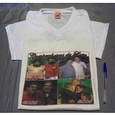 CAMISETA (TAM G) EM MALHA BRANCA, DE MANGA CURTA. NA FRENTE, A INSCRIÇÃO 'COMPANHEIROS DE LUTA' E ESTAMPA COM QUATRO FOTOGRAFIAS, MOSTRANDO O PRESIDENTE LULA AO LADO DE UM SENHOR, EM QUATRO MOMENTOS, NOS ANOS DE 1981, 1997, 2006 E 2008.