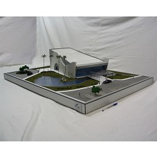 MAQUETE DA 'SALA DE CONCERTOS PRESIDENTE LULA', SEDE PRÓPRIA DA 'ORQUESTRA CRIANÇA CIDADÃ MENINOS DO COQUE'. MAQUETE REPRESENTANDO O ESPAÇO CULTURAL (22X27X65,5 CM) E ENTORNO (85X124,5 CM). EDIFÍCIO ASSUME FORMA DE UM VIOLINO, TENDO NA ENTRADA, NOME DA SALA. POSSUI ESPELHO D'ÁGUA E ESCULTURA EM FORMA DE NOTA MUSICAL. POSSUI REDOMA DE ACRÍLICO, SOLTA DA BASE.
