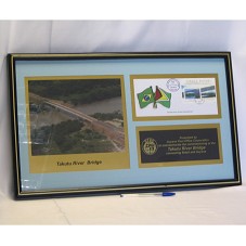 QUADRO (38X64 CM) COM MOLDURA PRETA E TAMPO DE VIDRO. EMOLDURA FOTOGRAFIA AÉREA DA PONTE TAKUTU, 'TAKUTU RIVER BRIDGE'; SELO POSTAL DA GUYANA, COM FOTOGRAFIA DA MESMA PONTE E A INSCRIÇÃO 'TAKUTU BRIGDE', COM CARIMBO POSTAL DE PRIMEIRO DIA DE CIRCULAÇÃO 'GPO GEORGETOWN / FIRST DAY SEP 14 2009 OF ISSUE / GUYANA'. ABAIXO, PLACA COM A INSCRIÇÃO 'PRESENTED BY GUYANA POST OFFICE CORPORATION TO COMMEMORATE THE COMMISSIONING OF THE TAKUTU RIVER BRIDGE / CONNECTING BRAZIL AND GUYANA'.