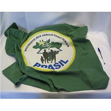 BANDEIRA (74X96 CM) EM TECIDO VERDE. POSSUI, AO CENTRO, LOGOMARCA DO 'MOVIMENTO DOS AGRICULTORES RURAIS', DESENHO DA SILHUETA DE UMA FAMÍLIA, TENDO AO FUNDO, UM LIVRO ABERTO DE ONDE SAI UMA PLANTA, COM O MAPA DO BRASIL EM SEGUNDO PLANO.