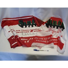 DUAS BANDEIRAS (51X70 CM CADA) EM TECIDO BRANCO E VERMELHO. POSSUI A INSCRIÇÃO 'SINTER / SINDICATO DOS TRABALHADORES EM EDUCAÇÃO DO ESTADO DE RORAIMA / FUNDADO EM 12 DE NOVEMBRO DE 1988 / FILIADO À CUT E À CNTE'. EM UMA DELAS, ESCRITO À MÃO, 'S.O.S. EDUCAÇÃO'.