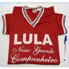 DUAS CAMISETAS IGUAIS (TAM M), EM MALHA VERMELHA, COM GOLA EM 'V'. NA FRENTE, A INSCRIÇÃO 'LULA NOSSO GRANDE COMPANHEIRO'.