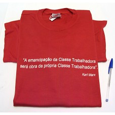 CAMISA (TAM G) EM TECIDO VERMELHO, DE MANGA CURTA. POSSUI, NA FRENTE, A INSCRIÇÃO 'A EMANCIPAÇÃO DA CLASSE TRABALHADORA SERÁ OBRA DA PRÓPRIA CLASSE TRABALHADORA / KARL MARX'. ATRÁS, 'FORMAÇÃO POLÍTICA E SINDICAL / UMA PRIORIDADE DO SINTER', E NOME DAS INSTITUIÇÕES DE REALIZAÇÃO E APOIO: 'SINTER / CNTE / SINDICATO DE EDUCADORES DA SUÉCIA'.