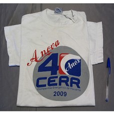 CAMISETA (TAM M) EM MALHA BRANCA, DE MANGA CURTA. NA FRENTE, ESTAMPA EM AZUL, VERMELHO E CINZA, COM A INSCRIÇÃO 'A NOVA / 40 ANOS / CERR / COMPANHIA ENERGÉTICA DE RORAIMA / 2009'. ATRÁS, 'UMA EMPRESA DO GOVERNO DE RORAIMA / TRABALHO PRA VALER, TRABALHO PRA CRESCER'.