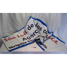 BANNER / FAIXA (65,5X299 CM) EM PLÁSTICO / LONA. BANNER DE FUNDO BRANCO, COM MOLDURA AZUL. POSSUI A INSCRIÇÃO 'SÃO LUÍZ DE MÃOS DADAS COM LULA / AGORA NO CAMINHO CERTO / OBRIGADO GOVERNADOR ANCHIETA, OBRIGADO PRESIDENTE LULA'. POSSUI ABERTURA NAS LATERAIS, PARA COLOCAÇÃO DE BASTÃO.