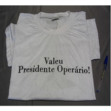 CAMISETA (TAM G) EM MALHA BRANCA, DE MANGA CURTA. NA FRENTE, A INSCRIÇÃO 'VALEU PRESIDENTE OPERÁRIO'. ATRÁS, 'UNIVERSIDADE FEDERAL FRONTEIRA SUL / UFFS / UMA GRANDE CONQUISTA', E DESENHO DO MAPA DA REGIÃO SUL DO PAÍS.