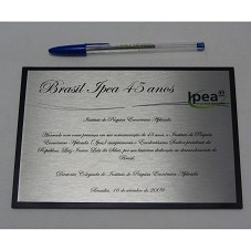 PLACA (13X19 CM) EM METAL PRATEADO ESCOVADO, CONTENDO A GRAVAÇÃO 'BRASIL IPEA 45 ANOS / INSTITUTO DE PESQUISA ECONÔMICA APLICADA / HONRADO COM VOSSA PRESENÇA EM SUA COMEMORAÇÃO DE 45 ANOS, O INSTITUTO DE PESQUISA ECONÔMICA APLICADA (IPEA) CUMPRIMENTA O EXCELENTÍSSIMO SENHOR PRESIDENTE DA REPÚBLICA, LUIZ INÁCIO LULA DA SILVA, POR SUA HISTÓRICA DEDICAÇÃO AO DESENVOLVIMENTO DO BRASIL. DIRETORIA COLEGIADA DO INSTITUTO DE PESQUISA ECONÔMICA APLICADA / BRASÍLIA, 16 DE SETEMBRO DE 2009'. FIXADA EM BASE DE ACRÍLICO PRETO (14X20 CM), E ACONDICIONADA EM ESTOJO FORRADO DE VELUDO PRETO.