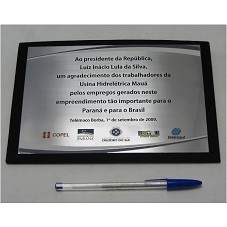 PLACA (14X20 CM) EM METAL PRATEADO, CONTENDO A GRAVAÇÃO 'AO PRESIDENTE DA REPÚBLICA, LUIZ INÁCIO LULA DA SILVA, UM AGRADECIMENTO DOS TRABALHADORES DA USINA HIDRELÉTRICA MAUÁ PELOS EMPREGOS GERADOS NESTE EMPREENDIMENTO TÃO IMPORTANTE PARA O PARANÁ E PARA O BRASIL / TELÊMACO BORBA, 1 DE SETEMBRO DE 2009'. ABAIXO, NOME E LOGOMARCAS DE INSTITUIÇÕES FEDERAIS E PRIVADAS. FIXADA EM BASE FORRADA DE VELUDO PRETO. ACONDICIONADA EM ESTOJO (4,3X24,5X17,7 CM) FORRADO DE MESMO MATERIAL.