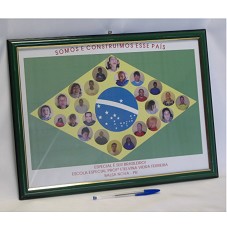 QUADRO (34X46 CM) COM MOLDURA EM MADEIRA LAMINADA DE VERDE, E TAMPO DE VIDRO. EMOLDURA GRAVURA IMPRESSA DA BANDEIRA BRASILEIRA, TENDO, NO LOSANGO AMARELO, DIVERSAS FOTOGRAFIAS DE ROSTOS DE PESSOAS. NA PARTE SUPERIOR A INSCRIÇÃO 'SOMOS E CONSTRUÍMOS ESSE PAÍS'; NA INFERIOR, 'ESPECIAL É SER BRASILEIRO / ESCOLA ESPECIAL PROF. ETELVINA VIEIRA FERREIRA / BALSA NOVA- PR'. NA PARTE POSTERIOR, PAPEL COLADO, CONTENDO A INSCRIÇÃO 'COMPREENDER O QUE É SER ESPECIAL EM UM MUNDO COM TANTAS DIFERENÇAS SOCIAIS, ECONÔMICAS E CULTURAIS É ESPELHAR-SE NO SENHOR, PRESIDENTE LULA / ALUNOS, PROFESSORES E FUNCIONÁRIOS DA ESCOLA ETELVINA VIEIRA FERREIRA / BALSA NOVA/2009'. ABAIXO, DEDICATÓRIA EM CANETA 'ABRAÇOS DA FAMÍLIA GONÇALVES / CAMPO LARGO-PR', E ENDEREÇO DA PREFEITURA MUNICIPAL DE BALSA NOVA.