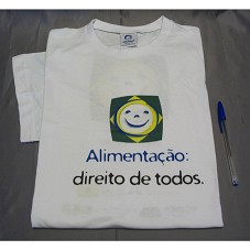 DUAS CAMISETAS (TAM M E G) EM MALHA BRANCA, DE MANGA CURTA. NA FRENTE, BANDEIRA ESTILIZADA DO BRASIL, COM DESENHO DE UMA ROSTO FELIZ, AO CENTRO, E A INSCRIÇÃO 'ALIMENTAÇÃO: DIREITO DE TODOS.'. ATRÁS, MESMA ESTAMPA E NOMES COM LOGOMARCAS DE INSTITUIÇÕES FEDERAIS E A INSCRIÇÃO 'ACESSE: WWW.PRESIDENCIA.GOV.BR/CONSEA'.