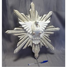 ESCULTURA (44X44X12 CM) DO DIVINO COM RESPLENDOR. FIGURA DE UMA POMBA, COM ASAS ABERTAS, CIRCUNDADA POR RAIOS. CONFECCIONADA EM MADEIRA, COM PINTURA EM PÁTINA BRANCA.