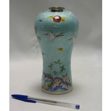 VASO DECORATIVO (17 CM), OU PARA FLORES, CONFECCIONADO EM PRATA, COM PARTE INTERNA BANHADA EM PORCELANA. POSSUI FORMA DOS TRADICIONAIS VASOS COREANOS E PINTURA EM ESMALTE-CLOISONNÈ. PINTURA SOBRE FUNDO AZULADO, COM DESENHOS DE ANIMAIS E FLORES. DECORADO COM OS DEZ SÍMBOLOS DA LONGEVIDADE, COMO OS CERVOS, TARTARUGAS, ETC, DESEJANDO SAÚDE ETERNA. ACOMPANHA PAPEL COM BREVE DESCRIÇÃO DA PEÇA. ACONDICIONADO EM CAIXA DE PAPELÃO, FORRADA COM PAPEL RECICLADO, NAS CORES BEGE E MARROM.