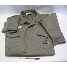 CAMISA / UNIFORME (TAM GG) EM TECIDO CINZA, DE MANGA COMPRIDA, COM ELÁSTICO NAS LATERAIS DA BARRA. POSSUI DOIS BOLSOS FRONTAIS, E, EM UM DELES BORDADO COM A INSCRIÇÃO 'ESTALEIRO ATLÂNTICO SUL' E LOGOMARCA. ATRÁS, MESMO BORDADO.