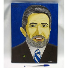 QUADRO (35X27 CM) SEM MOLDURA, COM TELA SOBRE CHASSIS DE MADEIRA. RETRATA O PRESIDENTE LULA, EM PLANO AMERICANO. FIGURA SOBRE FUNDO AZUL. NO CANTO INFERIOR DIREITO, ASSINATURA DO ARTISTA 'MISAEL'. ACOMPANHA BILHETE COM A INSCRIÇÃO 'APAE / CARIRÉ/PE / ALUNO: MISAEL'.