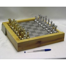 JOGO DE XADREZ ACONDICIONADO EM ESTOJO (5,5X30X31,5 CM) DE MADEIRA, ONDE A TAMPA É O TABULEIRO. PEÇAS CONFECCIONADAS EM METAL, NAS CORES DOURADA E PRATEADA. TABULEIRO EM METAL PRATEADO, COM QUADRICULADO EM XADREZ POLIDO E FOSCO. NA LATERAL DO ESTOJO, PLACA METÁLICA COM A INSCRIÇÃO 'INSTITUTO FEDERAL DE EDUCAÇÃO, CIÊNCIA E TECNOLOGIA CEARÁ / CAMPUS LIMOEIRO DO NORTE / PRESIDENTE LUIZ INÁCIO LULA DA SILVA / 10-09-2009'.
