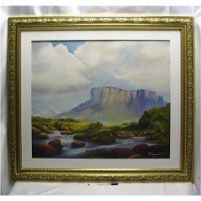 QUADRO (83X93 CM) COM MOLDURA DOURADA E PASSE-PARTOUT BRANCO. EMOLDURA PINTURA SOBRE TELA (60X80 CM) RETRATANDO UM RIO COM PEDRAS, E UM MORRO AO FUNDO. PREDOMINA TONS DE AZUL, VERDE E MARROM. NO CANTO INFERIOR DIREITO, ASSINATURA DO ARTISTA 'CARDOSO 2009'. NA PARTE POSTERIOR, INSCRIÇÃO COM DADOS DA PEÇA.