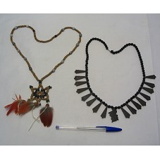 DOIS COLARES. O PRIMEIRO, EM SEMENTES PEQUENAS E ESCURAS, COM DETALHES EM LOSANGO, EM CASCA DE COCO, TENDO AO CENTRO O MAPA DE RORAIMA. O SEGUNDO, COM CORDÃO EM LASCAS MARROM, INTERCALADAS COM SEMENTES CINZA. POSSUI COMO PINGENTE UMA ESTRELA DE SEIS PONTAS, COM PENAS VERMELHAS EM TRÊS DELAS.