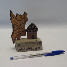 ARTESANATO (11,5X8,5X4,5 CM) CONFECCIONADO EM MADEIRA. MOSTRA O MAPA DE RORAIMA AO LADO DE UMA CABANA INDÍGENA. AMBOS FIXADO EM BASE DE MADEIRA, ONDE HÁ ORIFÍCIO PARA COLOCAÇÃO DE UM LÁPIS. NA FACE FRONTAL DA BASE, A INSCRIÇÃO 'BOA VISTA - RR'.