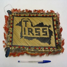 PAINEL (21X25,5 CM) CONFECCIONADO EM PALHA TRANÇADA, COM MOLDURA EM BAMBU, ORNADA COM SEMENTES E PENAS VERMELHAS. NO CENTRO DO PAINEL, DESENHO DE UM PÁSSARO (OU DO MAPA DE RORAIMA), E A INSCRIÇÃO 'T IRSS'.