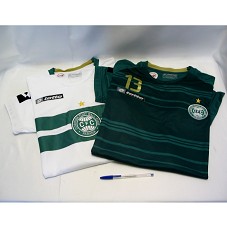 DUAS CAMISAS OFICIAIS (TAM G E EG) DO TIME DE FUTEBOL 'CORITIBA FOOT BALL CLUB'. UMA NA COR VERDE, DE NÚMERO '13' E COM O NOME 'LULA' GRAVADO NA PARTE POSTERIOR. A OUTRA, NA COR BRANCA, DE NÚMERO '10', E MESMO NOME GRAVADO.