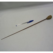 BATUTA (44 CM) COM BASTÃO EM MADEIRA LEVE DE TOM MÉDIO, E PEGADOR EM CORTIÇA. ACONDICIONADA EM ESTOJO DE VIDRO, COM TAMPA EM MESMO MATERIAL, ONDE HÁ LOGOMARCA DA 'ORQUESTRA CRIANÇA CIDADÃ'.