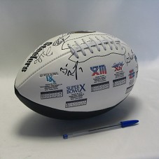 BOLA DE FUTEBOL AMERICANO, NAS CORES BRANCO E PRETO, AUTOGRAFADA. TEM A INSCRIÇÃO 'SUPER BOWL', DE UM LADO; E DESENHO DE UM CAPACETE E 'STEELERS' E 'LIMITED EDITION OF 10.000', DE OUTRO.