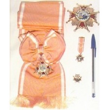 ORDEM DE ISABEL LA CATÓLICA, CONTENDO: UMA FAIXA (LARANJA COM LISTRAS BRANCAS) COM INSÍGNIA ; UMA FITA (LARANJA COM LISTRAS BRANCAS) COM INSÍGNIA; UM BÓTON E UMA MEDALHA. A INSÍGNIA DA FITA, DO BÓTON E DA MEDALHA SÃO AS MESMAS, E É COMPOSTA POR: UMA CRUZ EM METAL PRATEADO COM INTERIOR ESMALTADO NA COR VINHO E EXTREMIDADES ARREMATADAS POR ESFERAS DOURADAS, COM RAIOS DA MESMA COR ENTRE AS PONTAS. NO CENTRO, UMA COROA DE RAMOS ESMALTADA EM VERDE, COM FAIXA BRANCA EM SEU RAIO, GRAVADO 'A LA LEALTAD ACRISOLADA / POR ISABEL LA CATOLICA' E 'F.G', TENDO DESENHADO NO CENTRO DO CÍRCULO, DUAS COLUNAS, DUAS ESFERAS AZUIS E UMA COROA. NO TOPO DA COROA DE RAMOS, UMA COROA REAL. A INSÍGNIA DA FAIXA, POSSUI A MESMA COMPOSIÇÃO, PORÉM SEM A COROA DE RAMOS, TENDO NA FRENTE, UM CÍRCULO ESMALTADO DE BRANCO, INSCRITO 'A LA LEALTAD ACRISOLADA', E, ATRÁS, NA SEGUNDA FACE, 'F.G' AO CENTRO, EM DOURADO NUM CÍRCULO AZUL MARINHO, E 'POR ISABEL LA CATOLICA' EM DOURADO, INSCRITO NA BORDA BRANCA. ESTÁ PRESA À FAIXA POR UMA COROA DE RAMOS EM METAL DOURADO ESMALTADO DE VERDE. ACONDICIONADA EM CAIXA (12X26X5,5 CM) NA COR VINHO, COM DETALHES EM DOURADO E O BRASÃO DA ESPANHA EM METAL DOURADO, FIXADO NO CENTRO DA TAMPA.