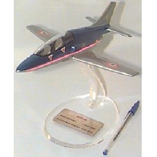 AEROMODELO (22,5X19X7 CM) DO JATO 'HJT-36', EM METAL, COM CORPO AZUL E PRATA, ASAS EM PRATA. TAMPA DA CABINE EM ACRÍLICO; POSSUI ADESIVOS COM INSCRIÇÃO 'HJT-36 / HAL' E, CÍRCULOS LARANJA/BRANCO/VERDE'. ENCAIXADO EM PINOS DE METAL, PRESOS AO PEDESTAL DA BASE (14X10X13 CM) DE ACRÍLICO . BASE OVAL, COM PEDESTAL CURVO. PLACA DOURADA (7,5X3,5 CM) FIXADA À BASE, GRAVADO 'HJT-36 / FIRST FLIGHT 07.03.2003 / INAUGURAL FLIGHT 21.03.2003'.