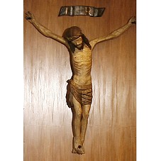 ESCULTURA EM MADEIRA POLICROMADA REPRESENTANDO A IMAGEM DO CORPO DE CRISTO CRUCIFICADO, TENDO, NA PARTE SUPERIOR, TABULETA COM A INSCRIÇÃO 'INRI'. OBRA DATADA, PROVAVELMENTE, DO SÉCULO XVII, TENDO SIDO RESTAURADA PELO CENTRO DE CONSERVAÇÃO E RESTAURAÇÃO DA UFMG.