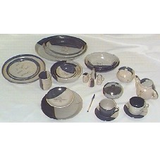 CONJUNTO DE JANTAR E CHÁ, EM CERÂMICA PINTADA, COMPOSTO POR: SEIS COPOS, UM BULE PARA CHÁ, SEIS XÍCARAS, SEIS PIRES, UM AÇUCAREIRO, UMA MANTEIGUEIRA, SEIS PRATOS RASOS, SEIS PRATOS MÉDIOS FUNDOS, JOGO DE QUATRO TRAVESSAS REDONDAS FUNDAS, JOGO DE TRÊS TRAVESSAS REDONDAS RASAS, JOGO DE TRÊS TRAVESSAS PEQUENAS OVAIS FUNDAS, JOGO DE TRÊS TRAVESSAS MÉDIAS E GRANDE OVAIS FUNDAS, E UM MOLHEIRO (PALITEIRO, SALEIRO, RECIPIENTE PARA ÓLEO E RECIPIENTE PARA VINAGRE - UM COM TAMPA E O OUTRO SEM). AÇUCAREIRO NÃO VEIO ACOMPANHADO DE COLHER. CERÂMICA PINTADA NAS CORES AZUL, CINZA E CREME, TENDO COMO MOTIVO FIGURAS RUPESTRES. EMBALADA E ACONDICIONADA EM CAIXA DE PAPELÃO. CADA PEÇA POSSUI GRAVADO NO FUNDO EXTERNO A INSCRIÇÃO 'CERAMICA SERRA DA CAPIVARA / PI / BRASIL'.