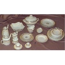 CONJUNTO DE JANTAR E CHÁ, EM PORCELANA BRANCA, COM DETALHES NA BORDA EM DOURADO E PRETO, TENDO PARTE DE CADA PEÇA PINTADA EM CREME. NO FUNDO EXTERNO, '18 VA 24 / VISTA ALEGRE / PORTUGAL / CHIADO'. PORCELANA DA MARCA VISTA ALEGRE, COMPOSTA POR: UMA TRAVESSA OVAL GRANDE; UMA TRAVESSA OVAL MÉDIA; UMA TRAVESSA REDONDA GRANDE RASA E UMA GRANDE FUNDA; UMA SOPEIRA; UMA SALADEIRA; UM BULE PARA CAFÉ E OUTRO PARA CHÁ; UMA MOLHEIRA; DOIS AÇUCAREIROS; DUAS LEITEIRAS; DUAS PETISQUEIRAS; DOZE XÍCARAS DE CAFÉ ACOMPANHADAS DE PIRES, E DOZE DE CHÁ, TAMBÉM COM PIRES; DOZE PRATOS DE SOBREMESA; DOZE PRATOS PEQUENOS; DOZE PRATOS RASOS; DOZE PRATOS FUNDOS; DOZE SUPLÁS; E UMA TRAVESSA OVAL PEQUENA, QUE CHEGOU COM UM PEQUENO PEDAÇO LASCADO. ACONDICIONADOS EM CAIXAS DE PAPELÃO.