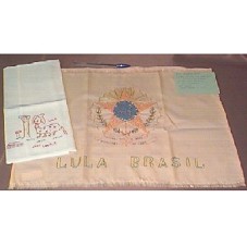 DOIS PEDAÇOS DE TECIDOS BORDADOS. O PRIMEIRO (47X36 CM) EM VISCOSE CREME-ALARANJADA, BORDADO UMA REPRESENTAÇÃO DO BRASÃO DA REPÚBLICA DO BRASIL, COM PONTAS DAS ESTRELAS EM LARANJA, CÍRCULO INTERNO EM AZUL COM MIÇANGAS VERMELHAS, E RAMOS NA PARTE INFERIOR, COM A INSCRIÇÃO EM VERDE 'ESTADOS UNIDOS DO BRASIL / 15 DE NOVEMBRO DE 1889' E ' LULA BRASIL'. ACOMPANHA CARTÃO GRAMPEADO NO TECIDO 'EXMO PRESIDENTE LULA, A BELEZA DA VIDA EM REDOR DE TI, É A FORÇA DO SEU CORAÇÃO. AS BOAS OBRAS APARECEM! E O POVO APLAUDEM. COM CARINHO MARIA TEIXEIRA DE BRITO.'. POSSUI DUAS BORDAS DESFIADAS. O SEGUNDO (38X31 CM) EM ALGODÃO BRANCO, TRAZ BORDADO NO CENTRO INFERIOR UM CACHORRO PERTO DE UMA ÁRVORE E UMA CASA MENOR, ESCRITO ESCOLA NO TELHADO DELA. COM A INSCRIÇÃO 'LALE / GÃO, 4 / LYGIA, 7'. ACOMPANHA CARTÃO 'PRIMEIRA DAMA MARISA, EU LHE DIGO: SUAS RIQUEZAS SÃO DURADOURAS. POIS VOCÊ CONSTITUIU DOS BENEFICIOS QUE SEMPRE PRESTOU AO POVO E TODA A NAÇÃO. TI QUERO BEM! MARIA TEIXEIRA DE BRITO. OBS: DE PARA O PT DE NOVO HORIZONTE, AQUELE VESTIDO VERMELHO NO DIA DA POSSE DO PRESIDENTE.'. ACONDICIONADOS EM SACO PLÁSTICO TRANSPARENTE, COM DESENHOS DE LUA E SOL.