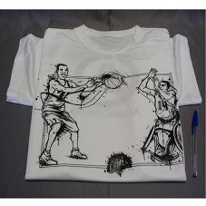 CAMISETA (TAM G) EM MALHA BRANCA, DE MANGA CURTA. NA FRENTE, ESTAMPA NA COR PRETA, COM DESENHO DE DOIS HOMENS JOGANDO BASQUETE, UM DELES EM CADEIRA DE RODAS. ATRÁS, LOGOMARCA E A INSCRIÇÃO 'AGUA DA ILHA'.
