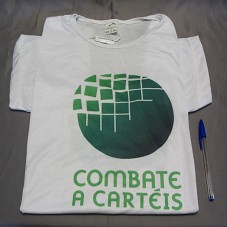 CAMISETA (TAM G) EM MALHA BRANCA, DE MANGA CURTA. NA FRENTE, ESTAMPA EM VERDE E A INSCRIÇÃO 'COMBATE A CARTÉIS'.